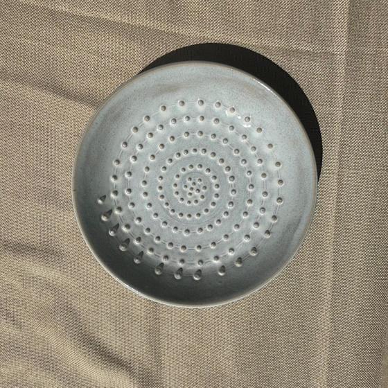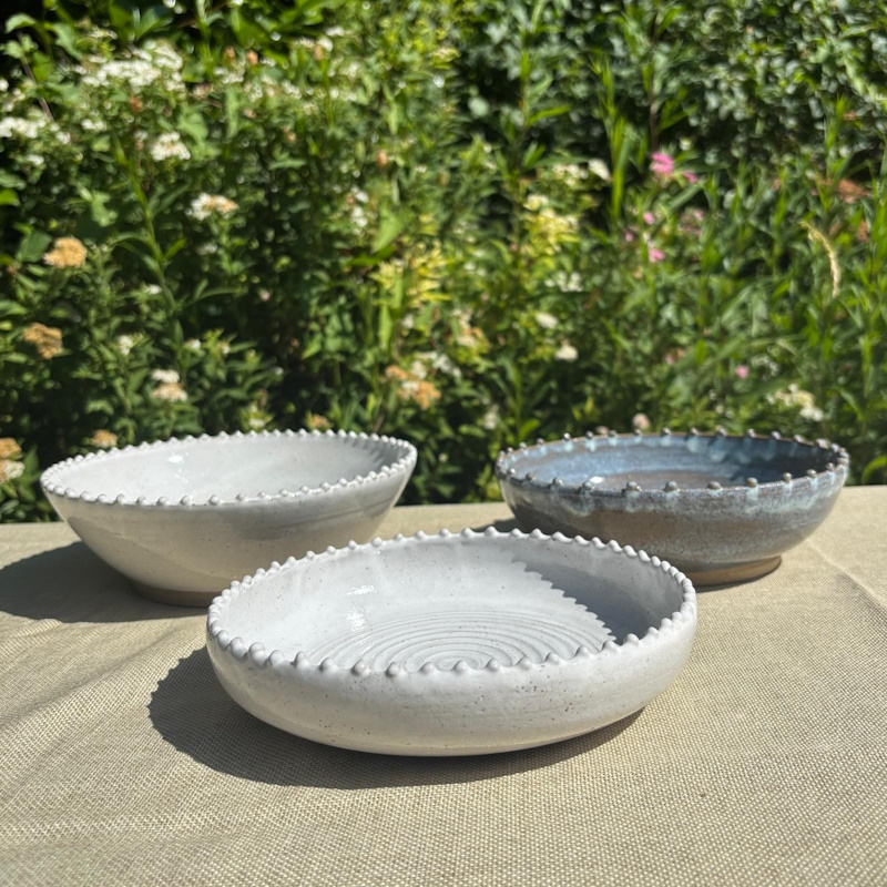 The pieces are thrown on the wheel using stoneware clay and hand decorated with coloured slips and glazes. They are oven and dishwasher safe.