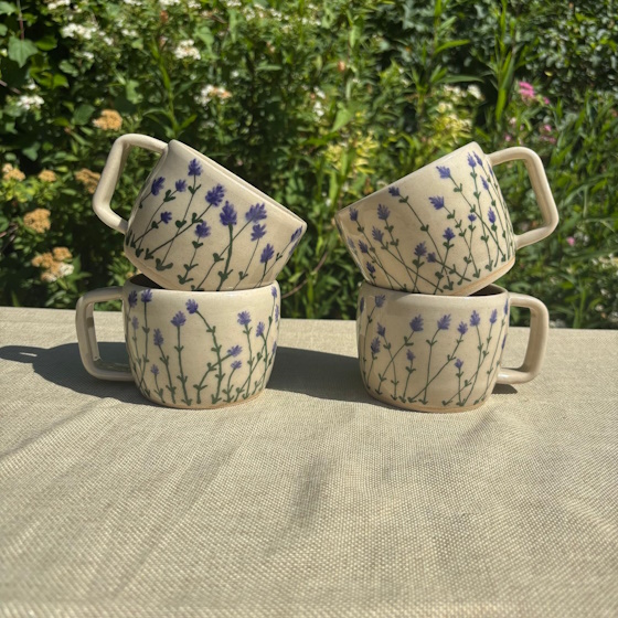 The pieces are thrown on the wheel using stoneware clay and hand decorated with coloured slips and glazes. They are oven and dishwasher safe.
